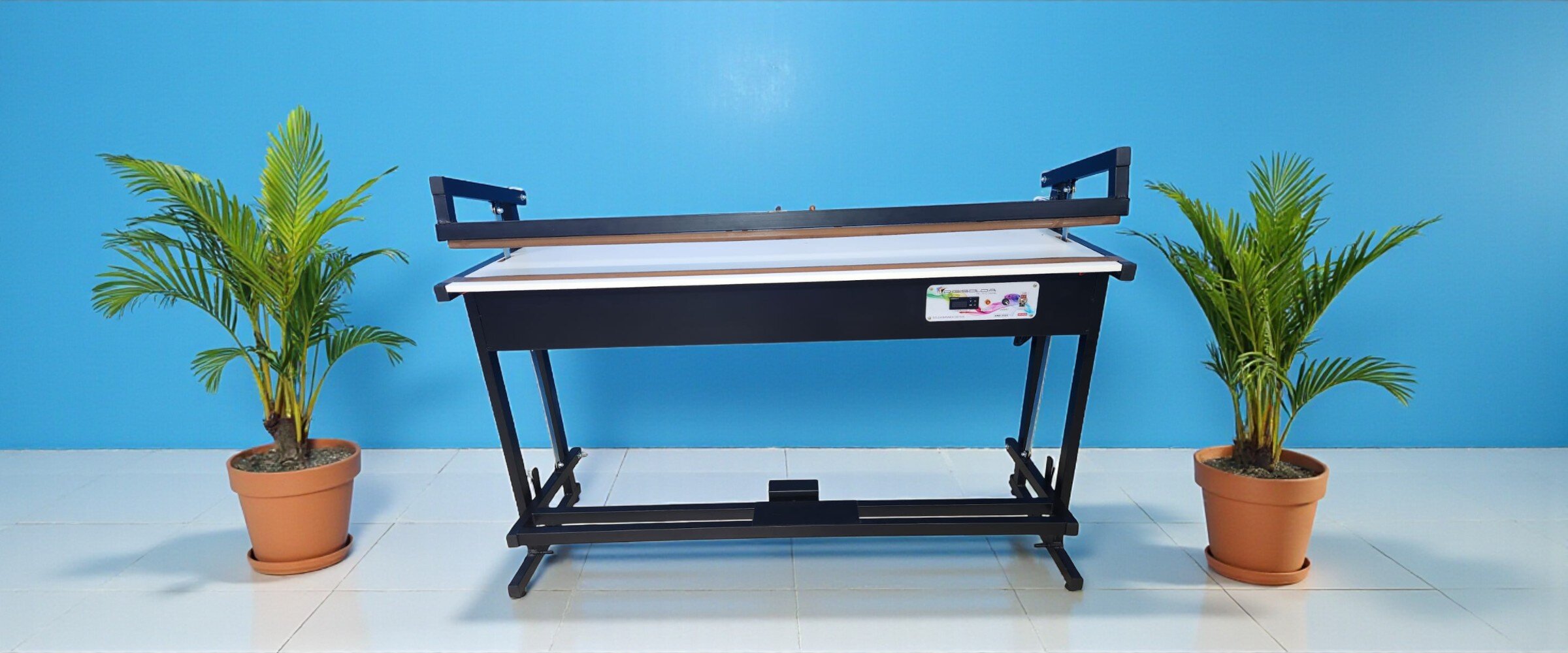 Se você precisa de um equipamento confiável, simples e de baixo custo para resolver a sua necessidade de acabamentos em banner, emenda de imagens, bainhas para ilhós, essa é a solução mais inteligente do mercado. Na busca incessante de melhorar cada vez mais nossos produtos, conseguimos desenvolver um produto que atende as necessidades do mercado com o melhor custo benefício da atualidade. Pois mesmo tratando-se de uma máquina simples, ela conta com esticadores embutidos, que além de proporcionar uma estética melhor, aumentam em muito a vida útil das resistências da máquina. Outra vantagem dessa máquina, é que ela pode trabalhar com resistências de 4mm ou de 10mm sem precisar nenhuma configuração adicional, se não apenas a substituição de uma largura pela outra. O pedal com trava desta máquina mercede um destaque, pois além de ser muitos mais confortável para o operador, libera ela para atuar em outra máquina também.